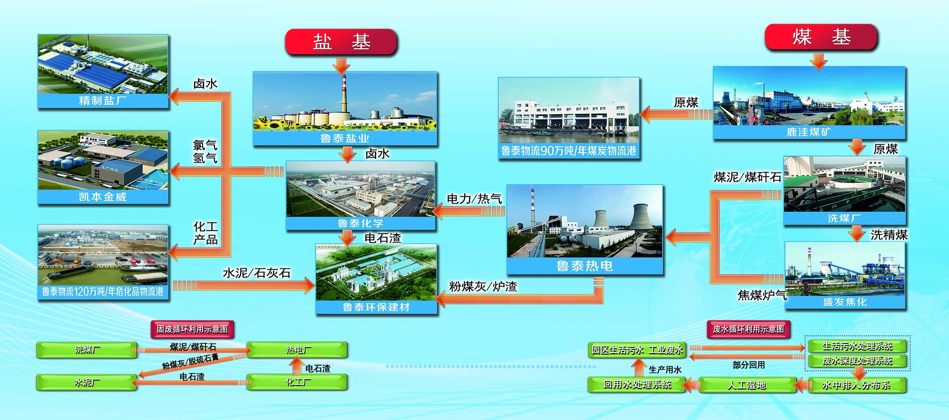 一体两翼,"一体"就是积极打造循环经济发展体。"两翼"就是"煤基"、"盐基"两链并举,加工制造业与服务业并举。制造业依托能源、资源,积极发展精细化工等高附加值产品。服务业重点发展生产服务、现代物流服务、金融服务。循环发展,就是以集团公司煤炭、盐资源的高效利用和循环利用为核心,围绕循环经济产业链条,上游延伸,下游配套,调整结构,转型升级,循环发展。