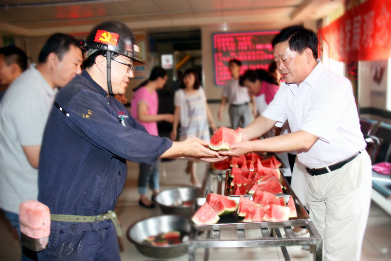 在上井口等候室,矿工兄弟有的在喝防暑降温的绿豆汤,也有的正开心地吃着清凉解暑的西瓜,大家脸上都洋溢着幸福、自豪、满足的微笑。