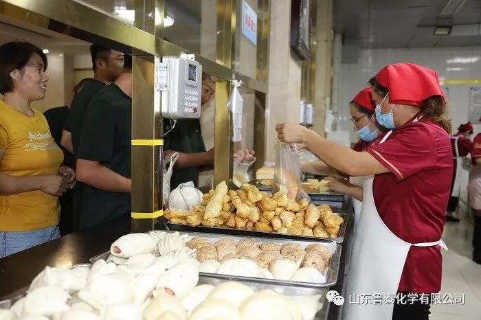 每天11时30分的铃声敲响的时候,络绎不绝的职工开始鱼贯而入,打破了餐厅的宁净,却在弥漫着恣意饭香的空气里添加了欢歌笑语的作料。每天12种菜品,连续2个小时,大厨手不离勺,保证荤素不离不弃,凉菜不离开香油,豆油保证非转基因,并确保每餐色、香、味俱全。麦面馒头、杂面馒头、米饭、葱油饼、花卷、糖包、豆包、菜包等主食整齐摆放于窗口,让职工爱不忍释。免费汤品、粥品应有尽有,还外加一份免费的水果。每样菜品、每种主食都明码标价,每餐5元保证职工汤足饭饱。饭后精制甜点也是鲁泰化学餐饮文化的一大特色,每天各型各色甜点被抢购一空,已司空见惯。如今,没有“吃不了兜着走”的现象,却出现了“吃饱了再兜走”的场景。餐厅小卖部商品的“进价售卖”,也让员工每天“满载而归”,多元的选择,让职工再也不必为“今天中午吃什么”的问题所困扰。