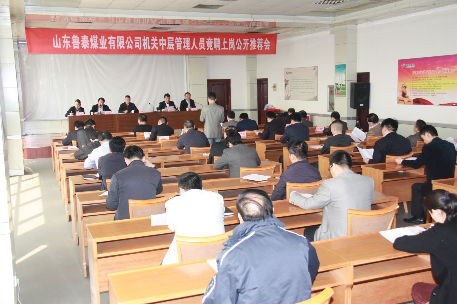 4月20日,公司下发《机关中层管理人员竞聘上岗工作实施方案》。20日,下午4:30,公司机关召开动员会,副总经理薛培华传达《竞聘方案》,公司总经理李合军作动员讲话。李合军指出,公司机关中层管理职位竞聘上岗,是贯彻落实市委、市政府和市国资委的指示要求。2013年6月,市委书记马平昌同志在到济宁能源调研时,对济矿集团机关中层管理人员全员下岗、全员竞聘上岗的做法,给予充分肯定,并要求市管企业学习借鉴。市委常委、常务副市长、市国资委党委书记刘中会同志在2014年3月市管企业县级国资监管机构负责人会议上,指出"要完善经营管理人才激励机制。以聘任制、任期制和经营目标责任制为主要内容,逐步对企业领导人员实行契约化管理,严格任期管理和目标考核,建立能上能下、能进能出的机制。推进企业领导人员选任方式与现代企业制度接轨,逐步提高市场化选聘比例,通过组织选拔、公开招聘、竞争上岗等多种方式,真正把优秀人才选出来、用起来。"市国资委曹旭东主任在市管企业县级国资监管机构负责人会议上,指出要"继续深化企业人事制度改革。全面推行企业各级管理人员聘任制、任期制,逐步加大企业管理人员竞争性市场化选聘力度。"根据市委、市政府和市国资委的要求,公司对企业行政主要负责人进行了竞聘上岗。这次公司对机关中层管理职位进行竞聘上岗,既是上级领导的指示要求,也是公司度危求进、应对严峻经济形势而作出的重要决策。李合军希望符合竞聘条件的人员积极报名参加竞聘。公司各企业分别召开动员会,对竞聘工作进行了广泛动员。截止到4月21日报名截止时间,共有67名同志报名应聘。4月22日上午,公司召开党政联席会,对报名者进行资格审查,符合竞聘条件的有57名同志。资格审查结束后,进行了公开推荐。市国资委企业领导人员管理科(党委组织部)马新华科长(部长)、毛莹等到会监督指导公开推荐。
