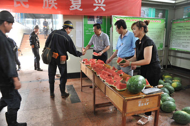 在井口信息大厅,党委书记刘岭、纪委书记兼工会主席王端焕和女工家属协管员们一起将一块块香甜可口的西瓜和一碗碗清凉解暑的绿豆汤送到一线矿工手中,亲切叮嘱矿工们天气炎热,一定要注意安全生产。