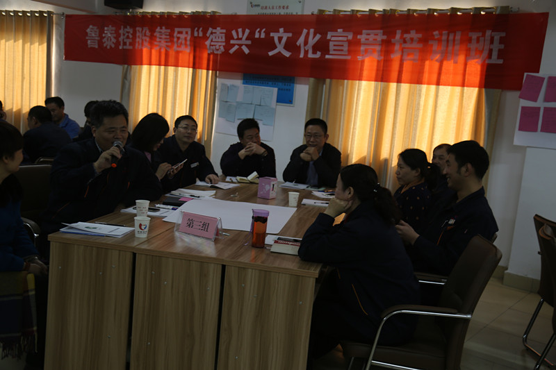 培训中,讲师通过组织"破冰活动"讲授了团队建设的重要性,让参训人员深刻体会到"团结就是力量";利用奖励机制,使参训人员积极思考企业文化在经营管理中的作用,回顾在企业管理中的困惑,学员深刻理解了企业文化的重要性;通过引用经典语句,诠释了"德兴"文化内涵,使参训人员理解了企业文化精髓要"入脑、入心、入眼、入行",在发展战略上要建设"绿色、创新、卓越、幸福的新鲁泰,成为绿色发展的实践者、轻资产运营的示范者、新兴产业的引领者"。培训过程气氛活跃,参训人员表现积极主动。